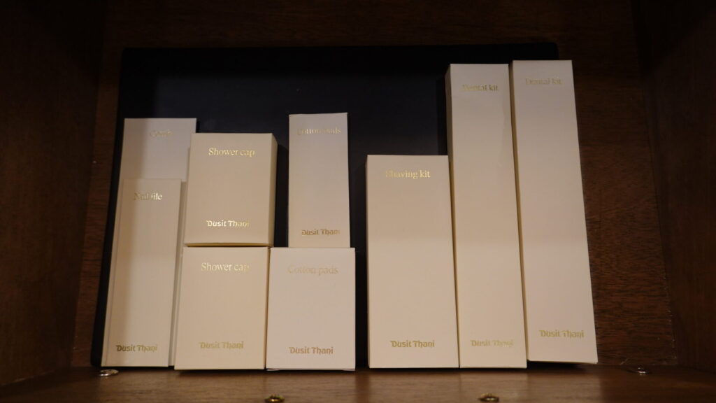 歯ブラシやシャワーキャップなどは箱入りで基本的なラインナップです。