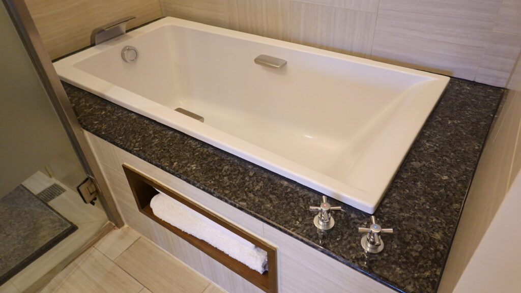 バスタブの上に物干しロープがあり、濡れた水着を乾かすことができました(ホテルの規約でバルコニーに水着を干すのは禁止されています)
