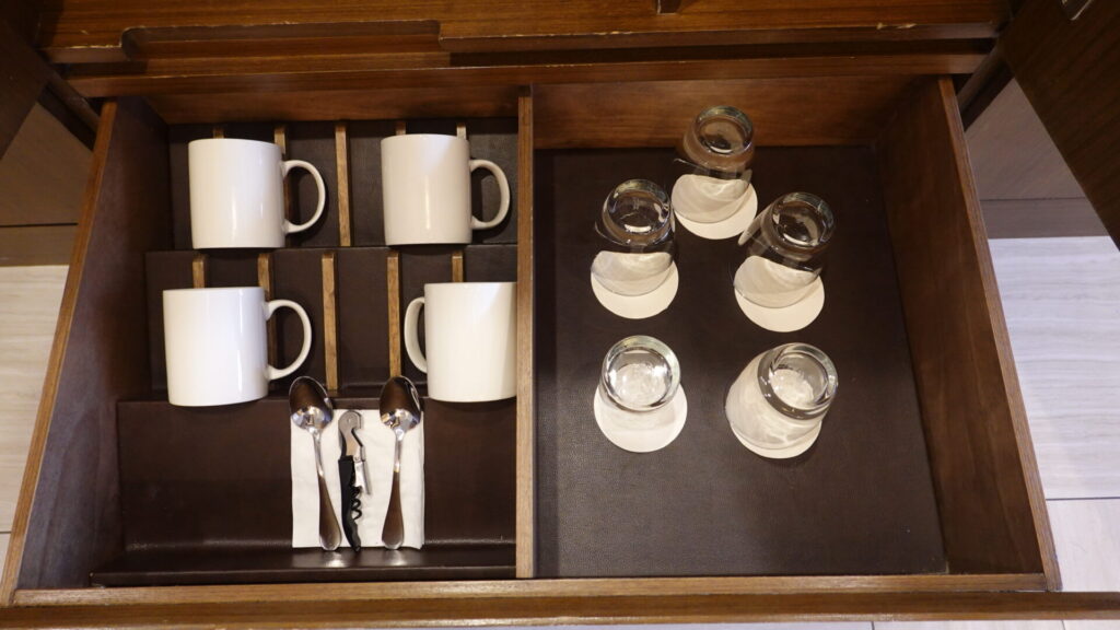 お部屋で快適に過ごせるアメニティや食器が充実しています。