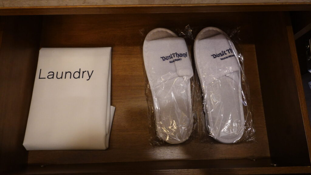 デュシタニに使い捨てスリッパあってよかったー!(海外のホテルはグレードにもよりますがアメニティとしてスリッパを置いてないホテルもあります。)